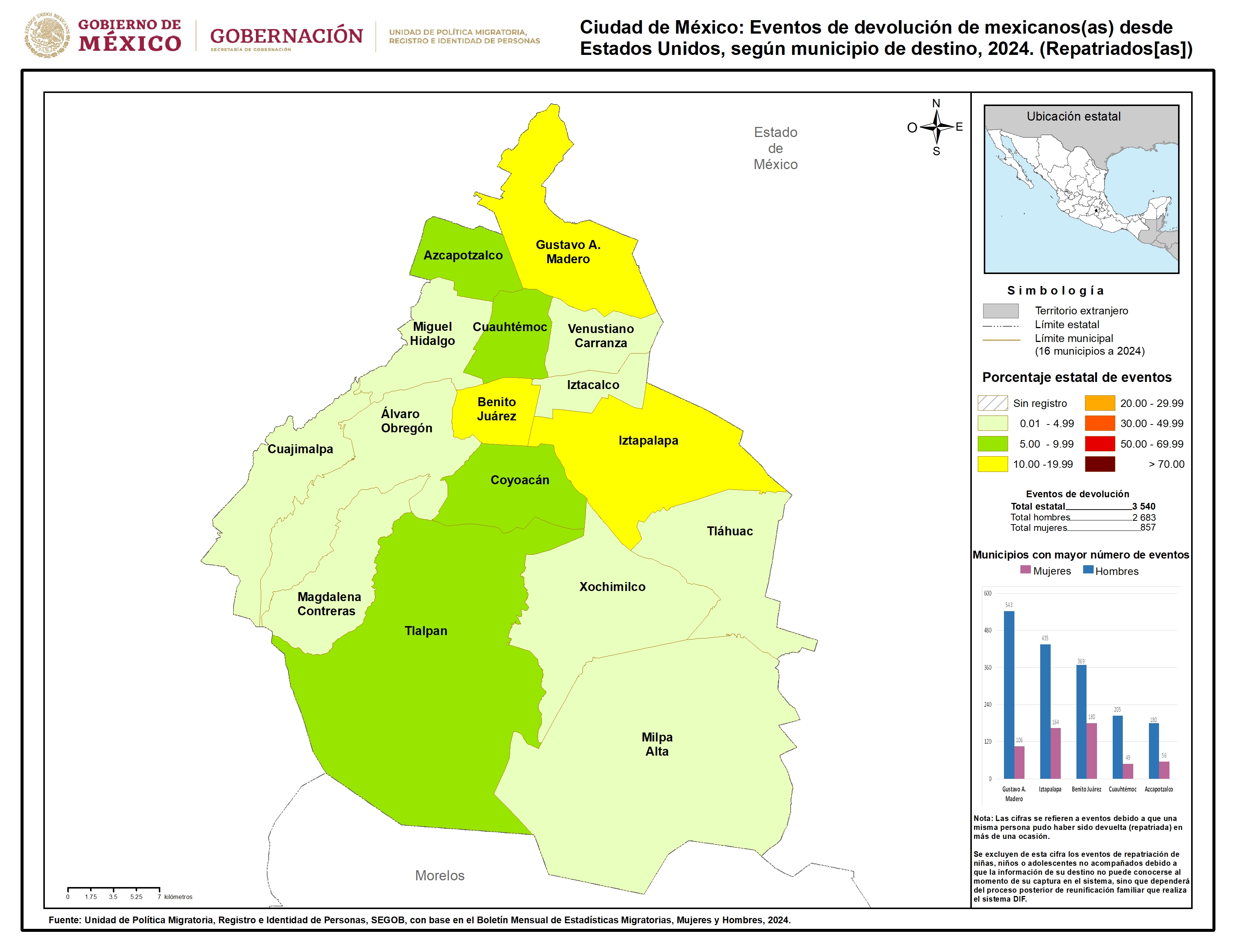 - Ciudad de México: Eventos de devolución de mexicanos(as) desde Estados Unidos, según municipio de destino, 2024. (Repatriados[as])