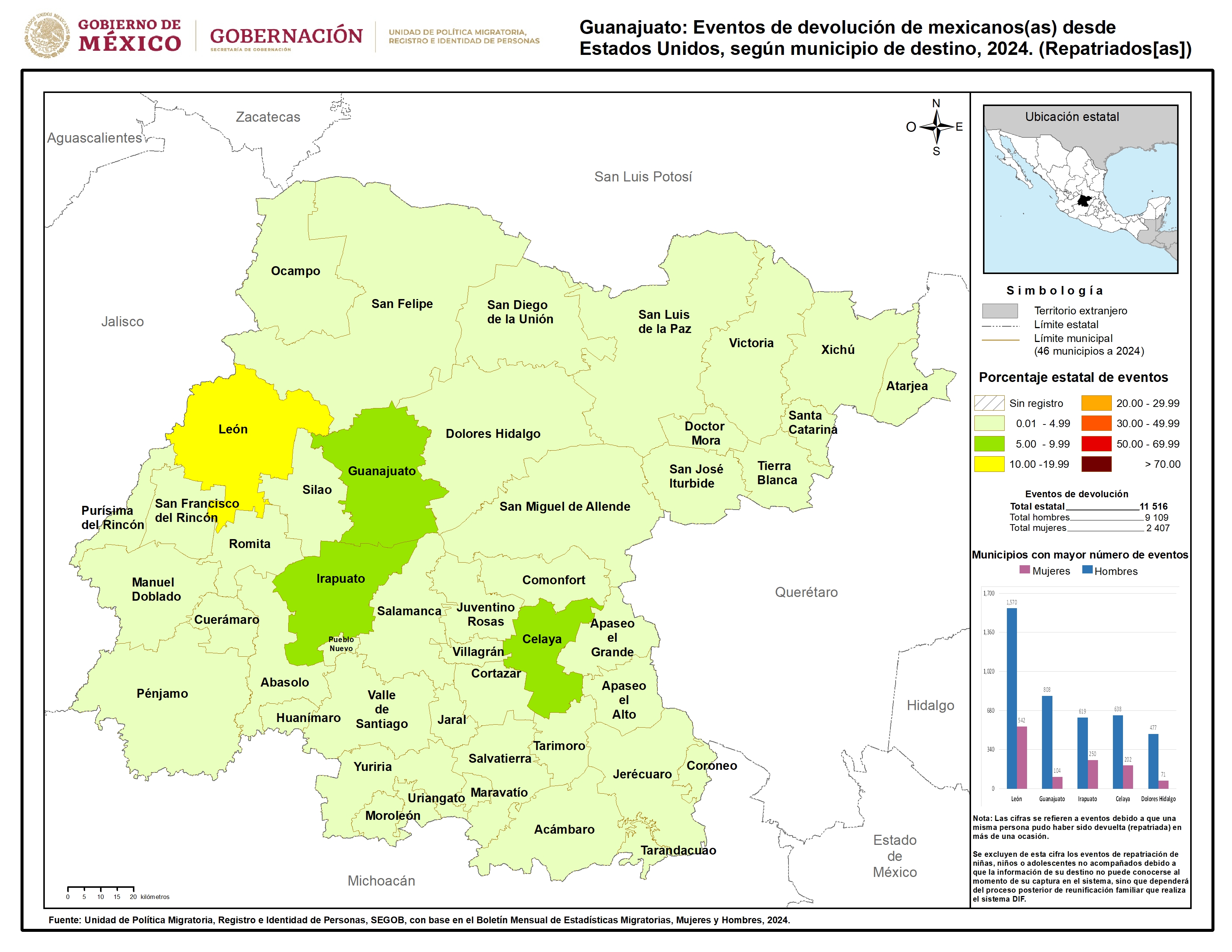 - Guanajuato: Eventos de devolución de mexicanos(as) desde Estados Unidos, según municipio de destino, 2024. (Repatriados[as])
