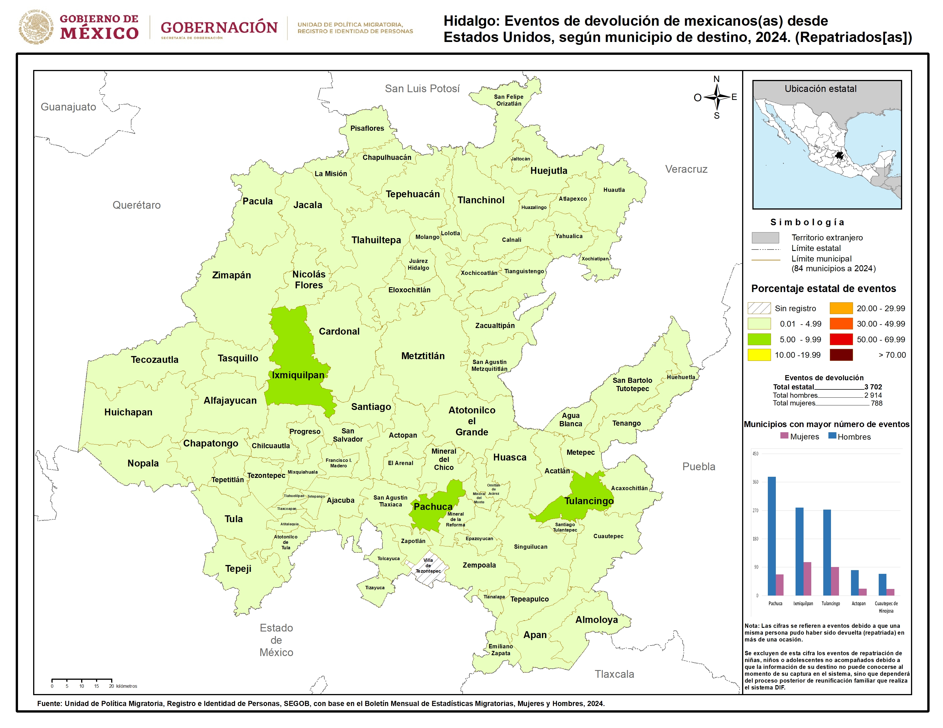 - Hidalgo: Eventos de devolución de mexicanos(as) desde Estados Unidos, según municipio de destino, 2024. (Repatriados[as])