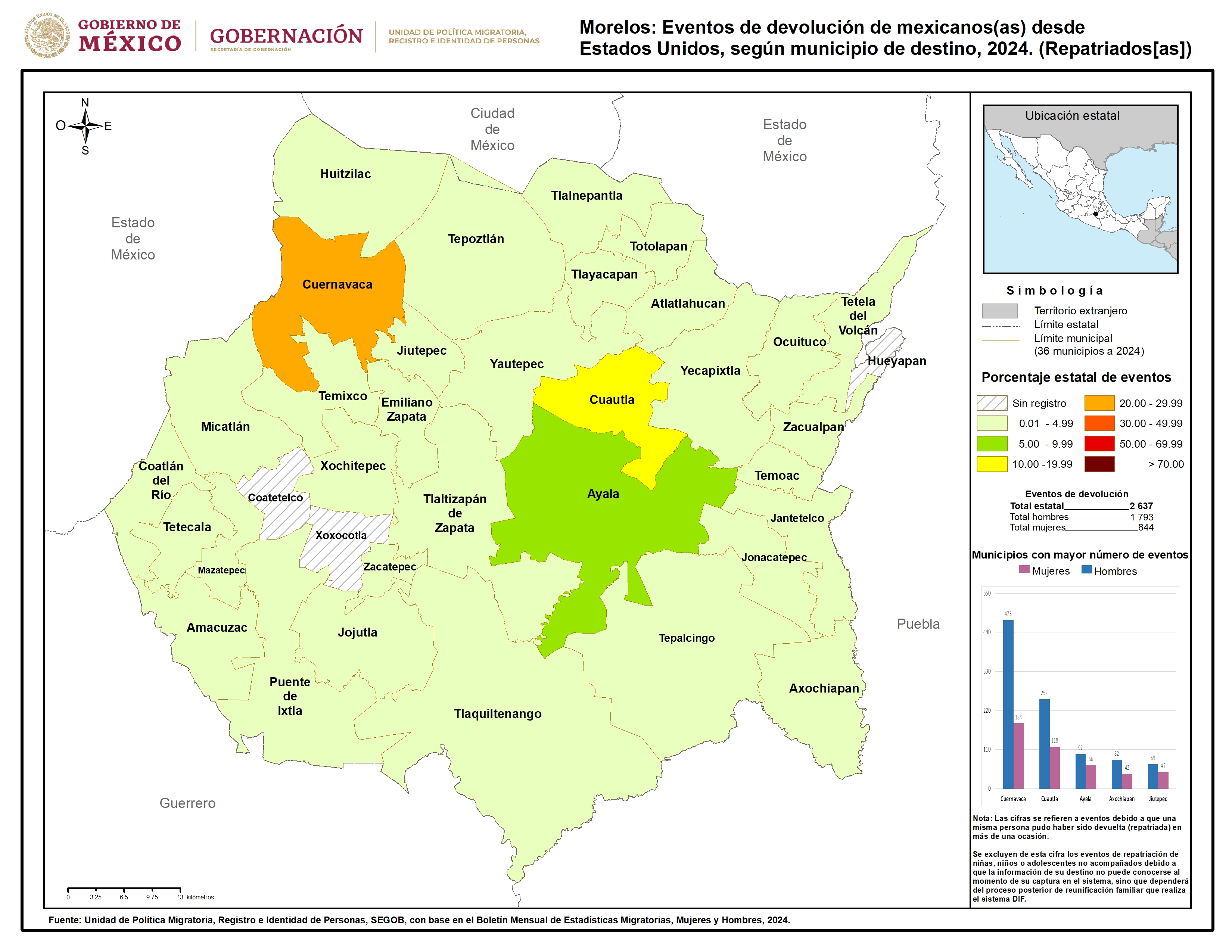 - Morelos: Eventos de devolución de mexicanos(as) desde Estados Unidos, según municipio de destino, 2024. (Repatriados[as])