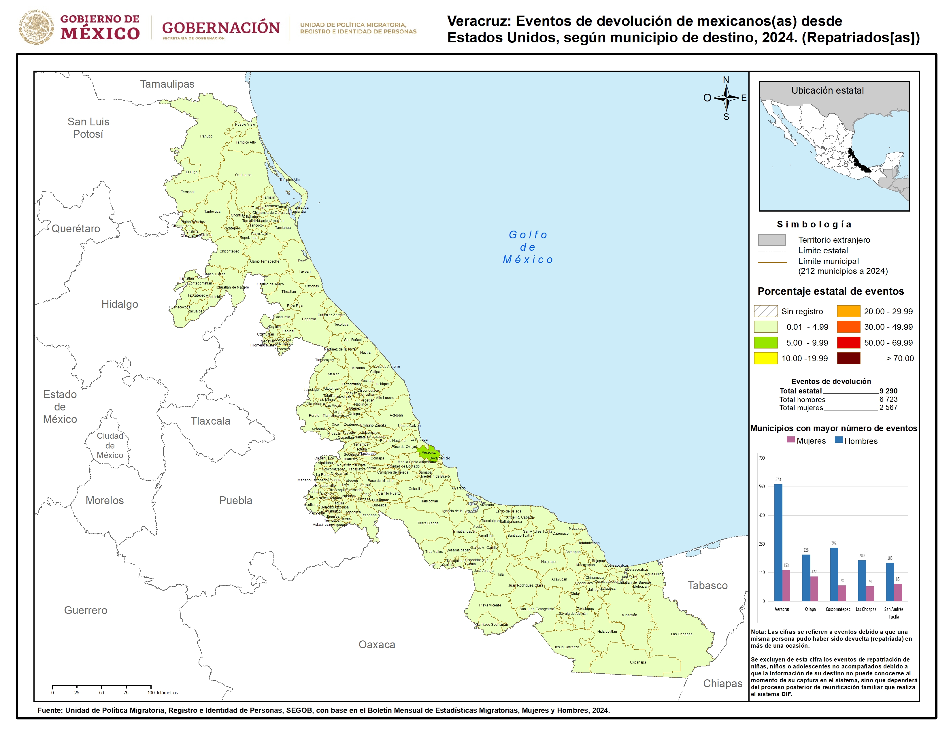 - Veracruz: Eventos de devolución de mexicanos(as) desde Estados Unidos, según municipio de destino, 2024. (Repatriados[as])