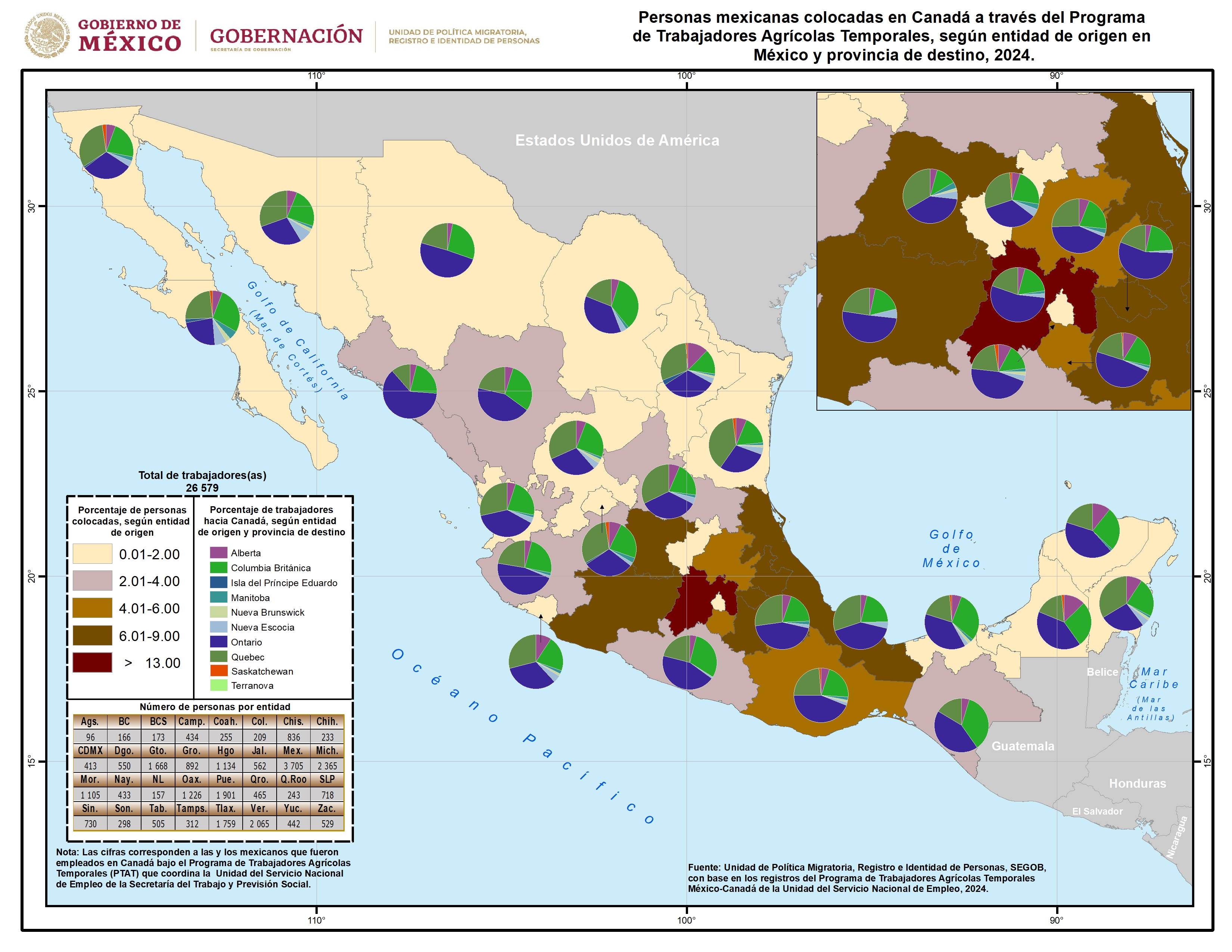 - Personas mexicanas colocadas en Canadá a través del Programa de Trabajadores Agrícolas Temporales, según entidad de origen en México y provincia de destino, 2024