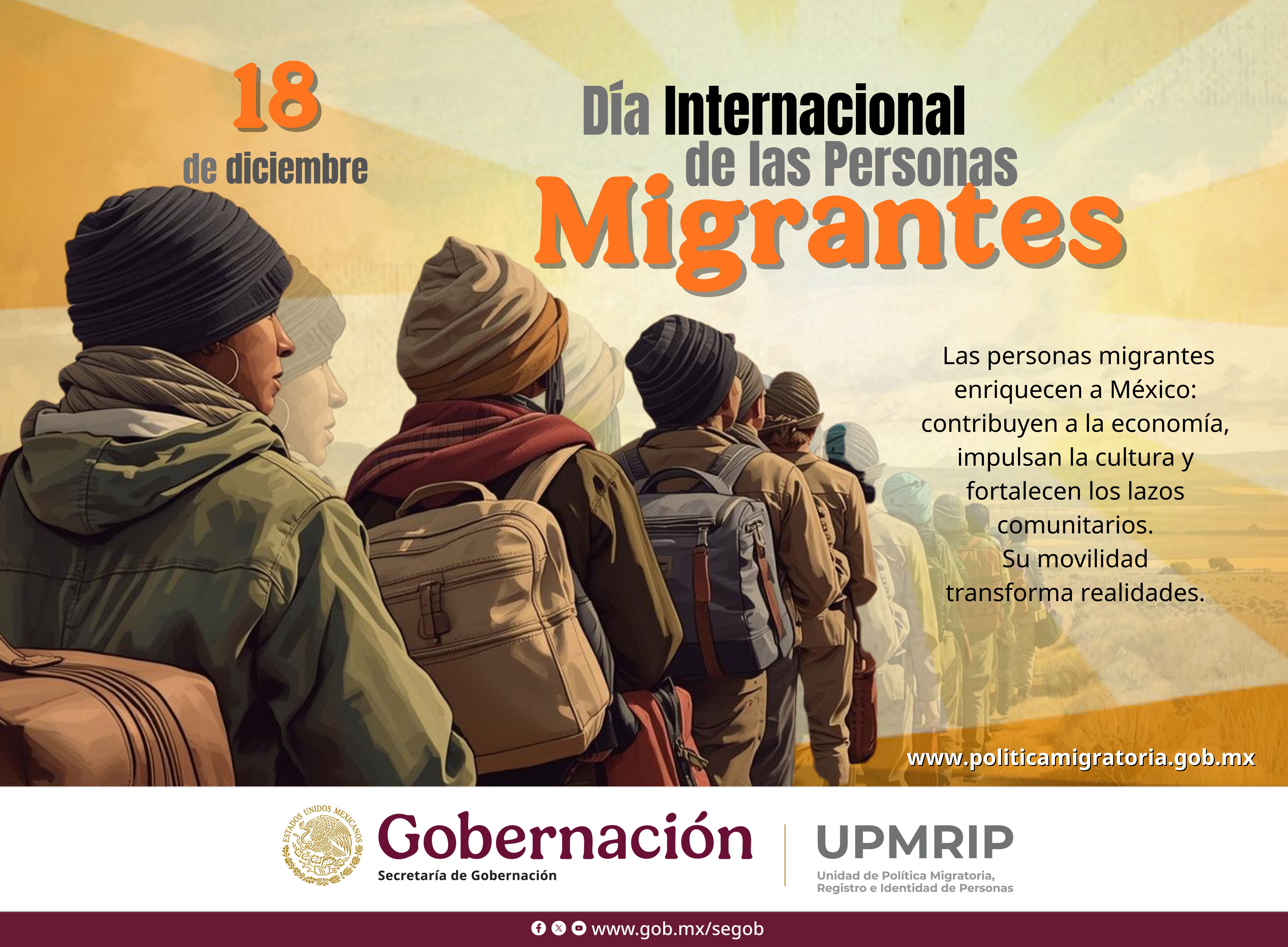 Objetivo: Visibilizar y reconocer las contribuciones sociales, culturales y económicas de las personas migrantes, así como promover el respeto, la protección y la garantía de sus derechos humanos, mediante la difusión de información y mensajes que fomenten una narrativa incluyente, solidaria y con enfoque humanista sobre la movilidad humana, en el marco del Día Internacional de las Personas Migrantes..