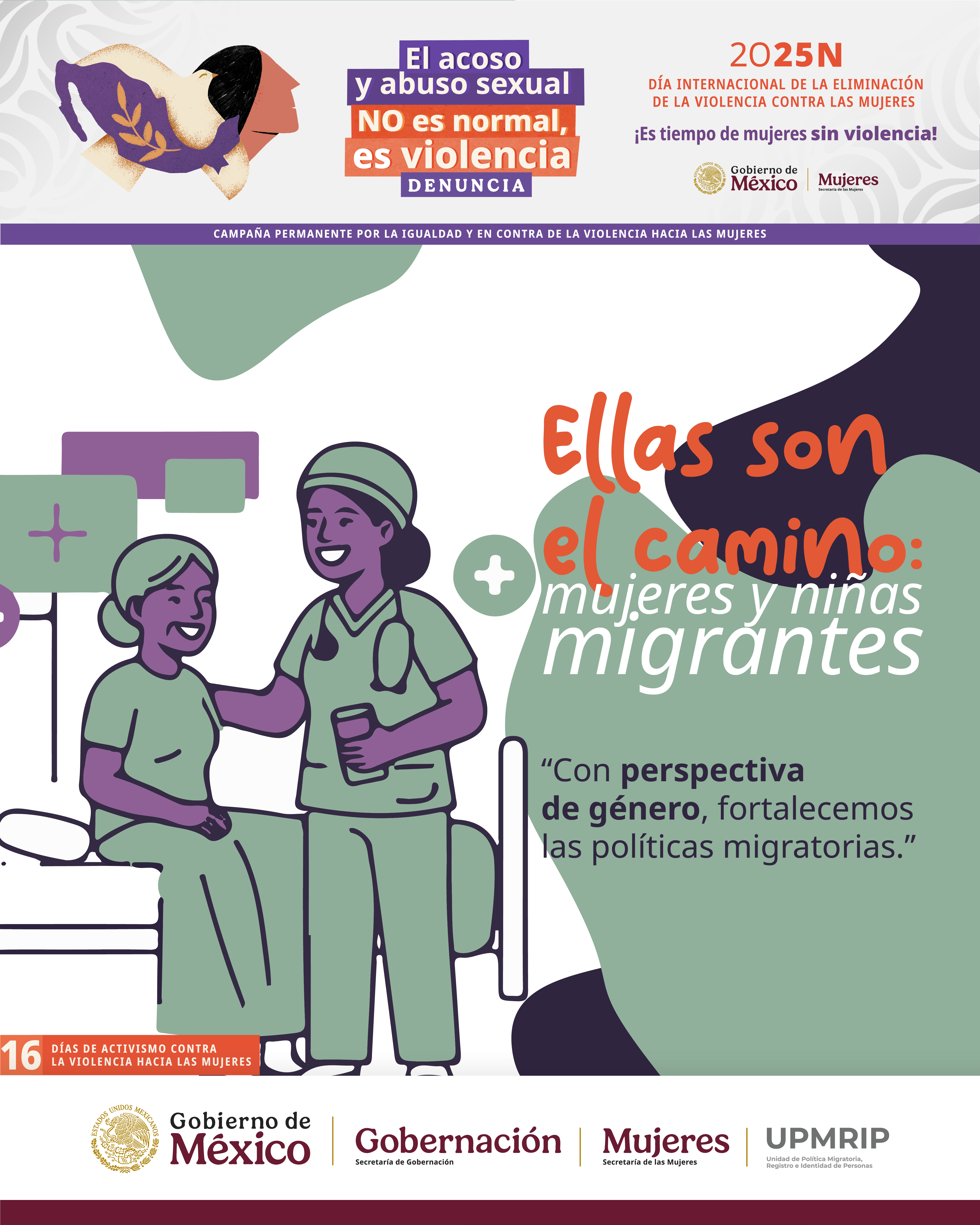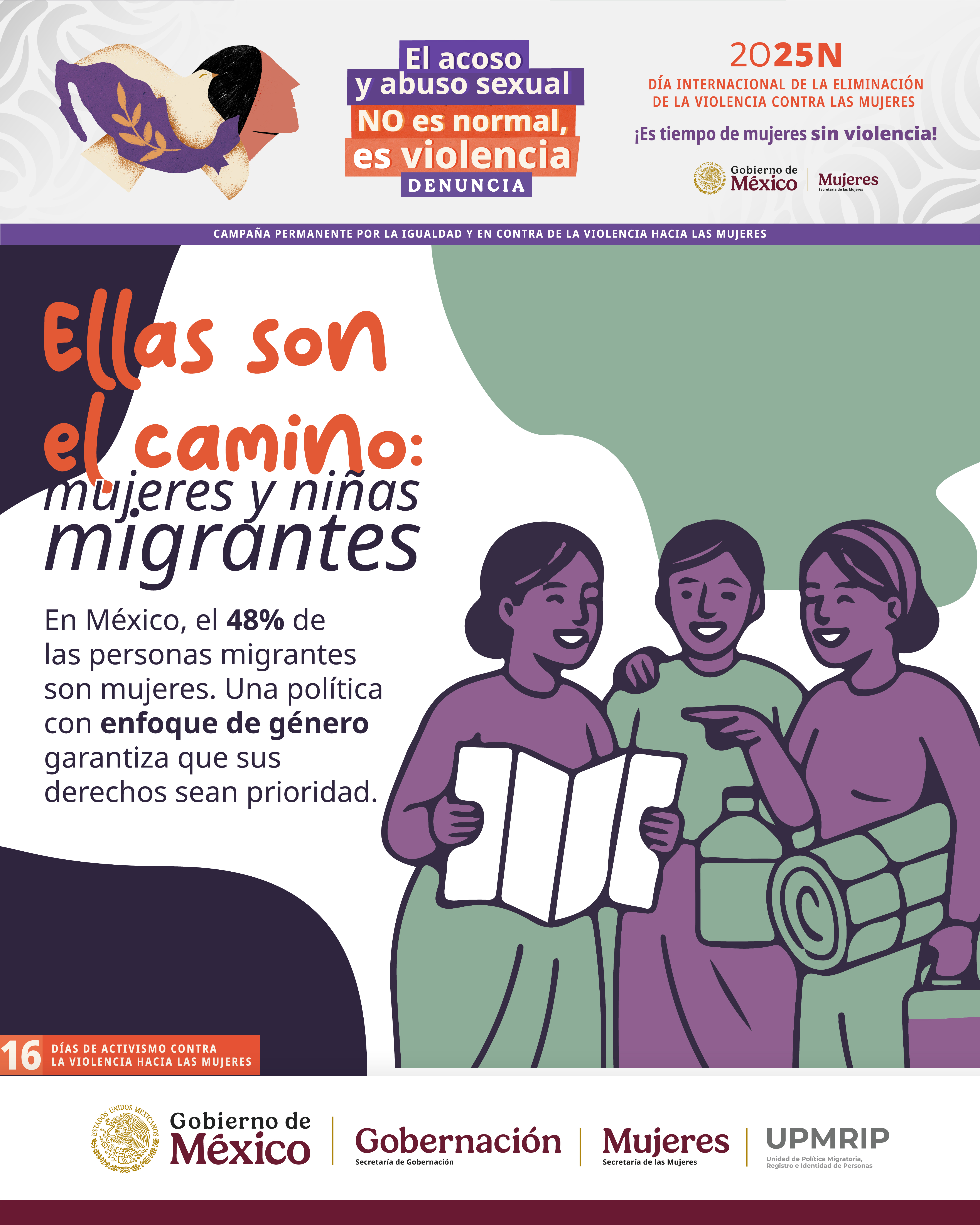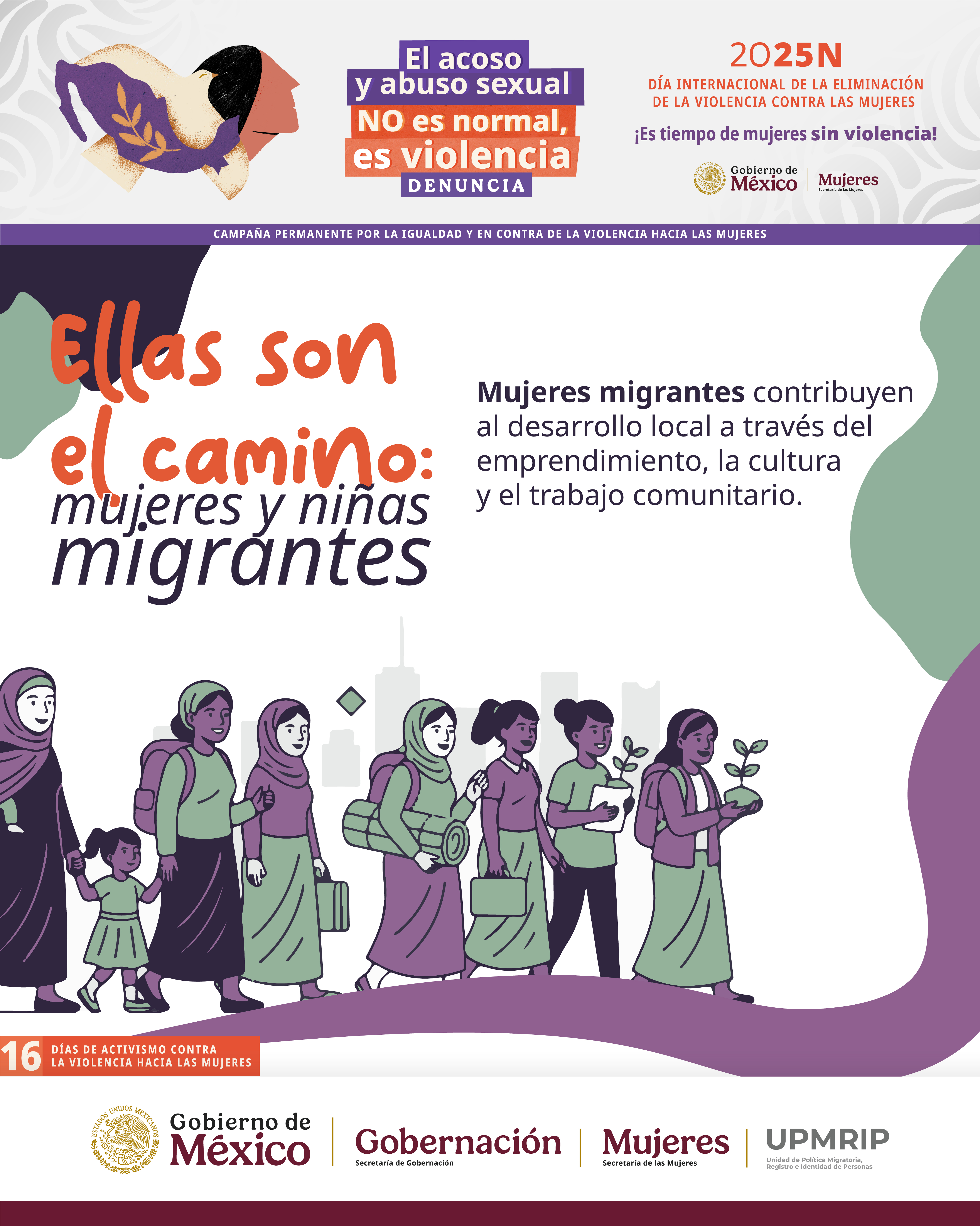 Objetivo: Difundir información que visibilice la participación, aportes y derechos de las niñas, adolescentes y mujeres migrantes, promoviendo el reconocimiento de su papel activo en las comunidades y la importancia de integrar la perspectiva de género en las políticas migratorias, en el marco del Día Internacional de la Eliminación de la Violencia contra la Mujer.