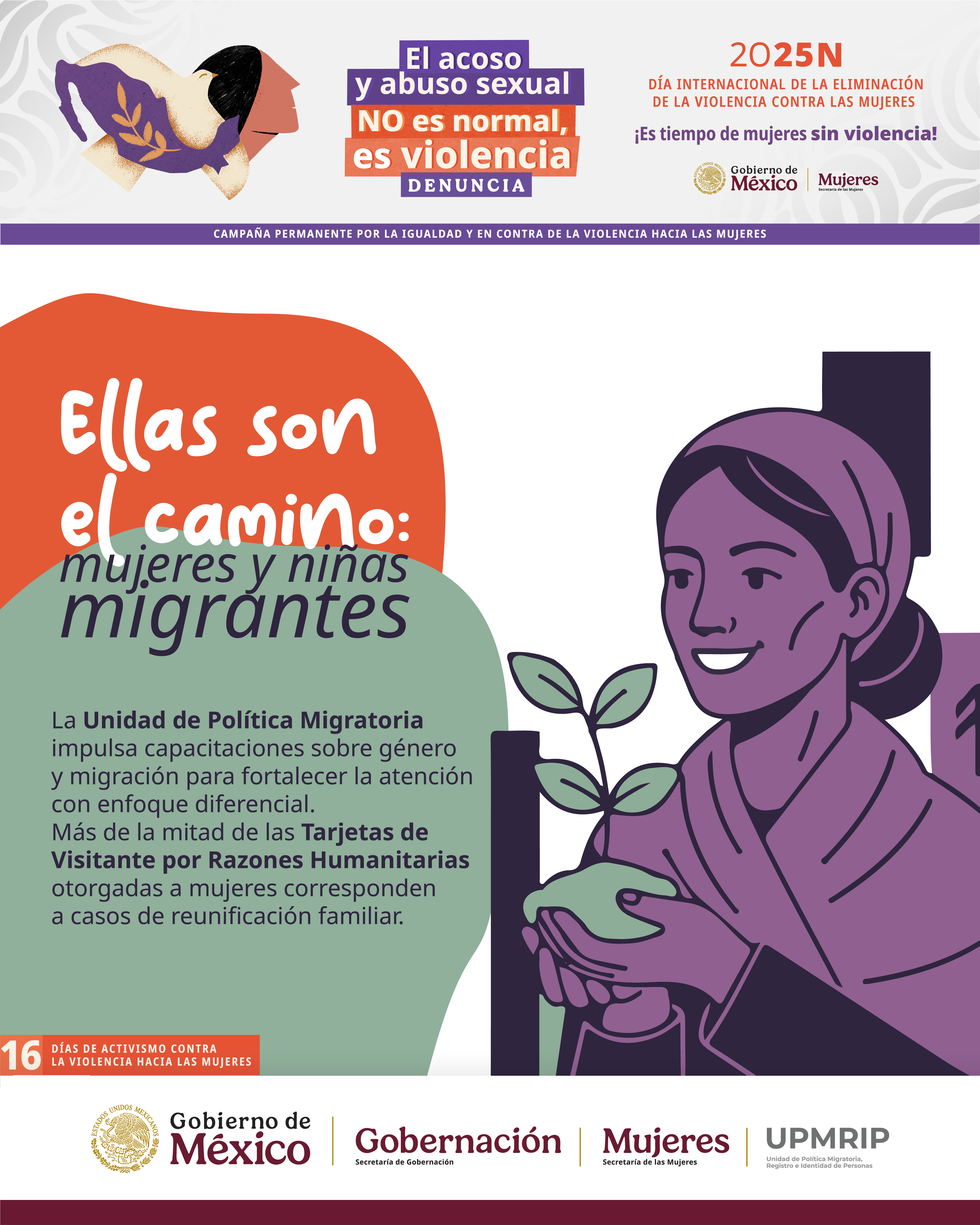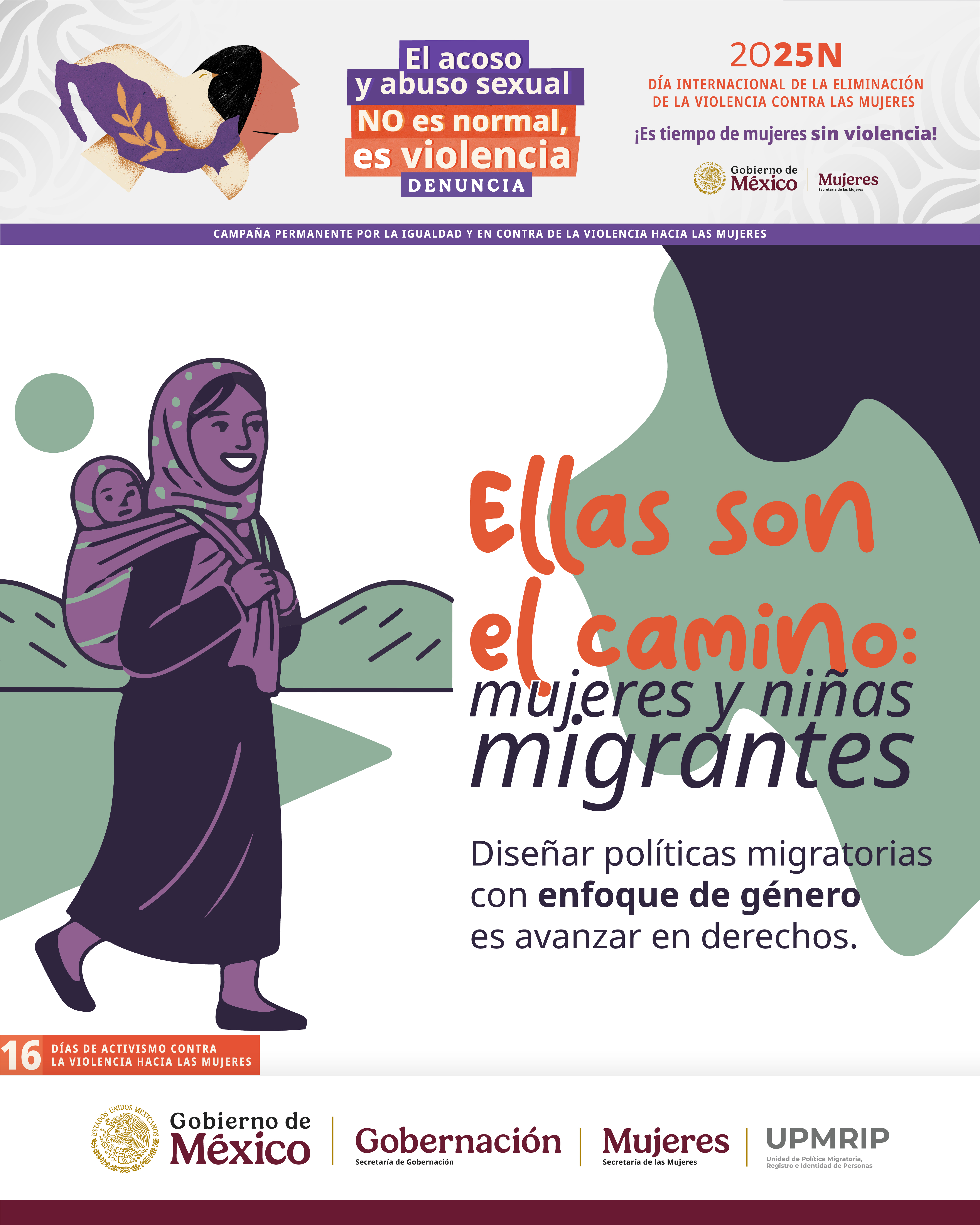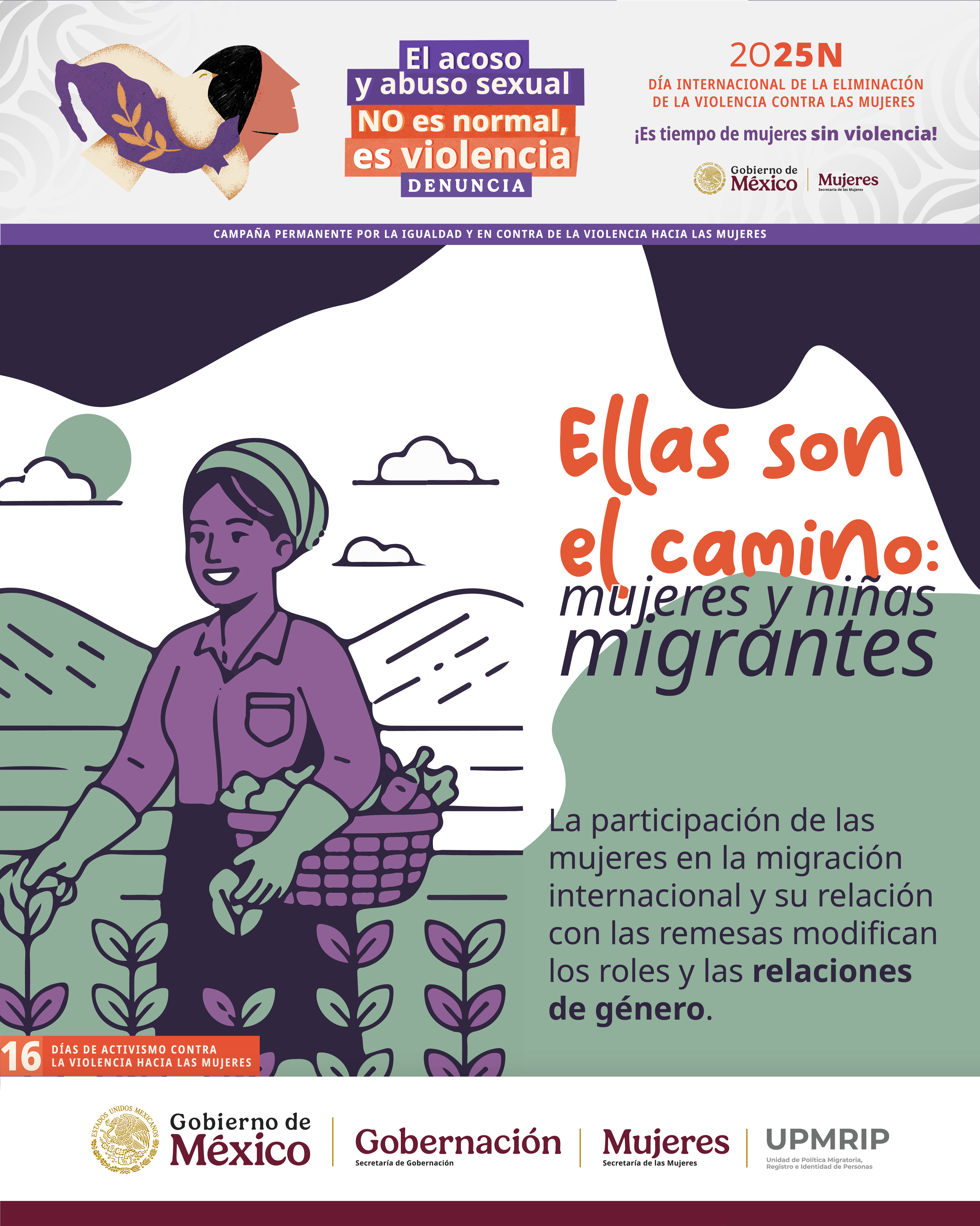 Objetivo: Difundir información que visibilice la participación, aportes y derechos de las niñas, adolescentes y mujeres migrantes, promoviendo el reconocimiento de su papel activo en las comunidades y la importancia de integrar la perspectiva de género en las políticas migratorias, en el marco del Día Internacional de la Eliminación de la Violencia contra la Mujer.