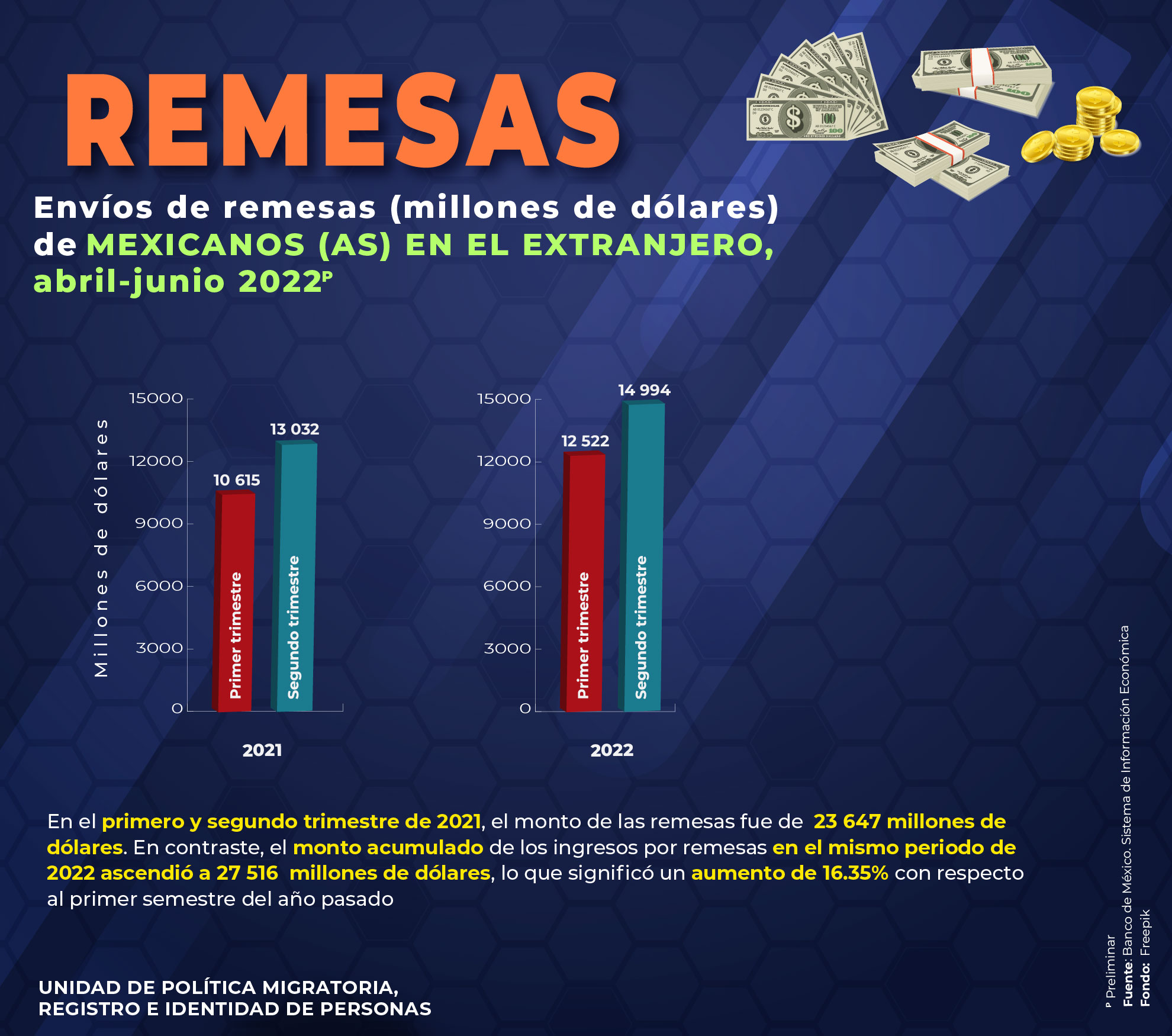- Envíos de remesas (millones de dólares) de Mexicanos(as) en el extranjero, abril-junio 2022
